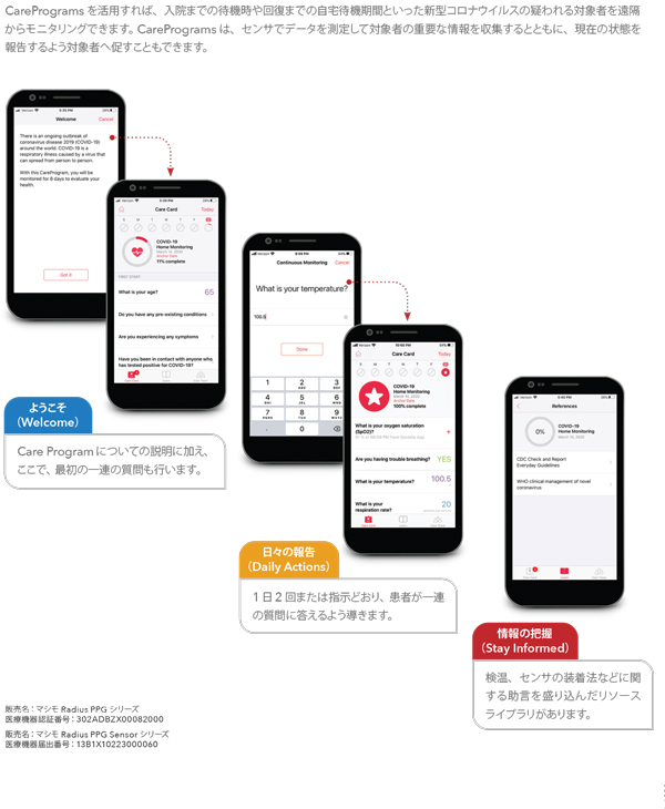 CareProgramsを活用すれば、入院までの待機時や回復までの自宅待機期間といった新型コロナウイルスの疑われる対象者を遠隔からモニタリングできます。CareProgramsは、センサでデータを測定して対象者の重要な情報を収集するとともに、現在の状態を報告するよう対象者へ促すこともできます。