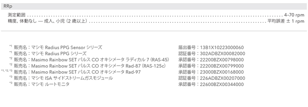 | > | 成人と小児の患者様に使用可能: RRp は、成人と小児(2 歳以上)の患者様に連続的 かつ非侵襲的に呼吸数のモニタリングが可能です。 |